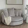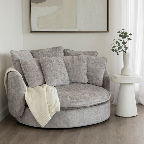 Faites de CLÉMENTINE votre nid douillet. Ce fauteuil pivotant rond et surdimensionné est parfait pour un moment de détente en solo, ou pour se blottir confortablement avec les gens que vous aimez!
