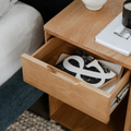 Pensée pour le quotidien, elle combine un tiroir discret avec fermeture amortie et un espace ouvert pratique pour garder vos essentiels à portée de main. Sa poignée intégrée, délicatement découpée dans le bois, renforce son esthétique sobre et raffinée.
