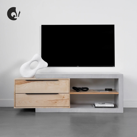 Ce meuble télé est conçu en béton (la partie en ''C'' est soufflée et recouverte de béton, elle a été développée dans le but d'être légère tout en conservant l'aspect brut du béton) et en placage de merisier (caisson, contour du caisson et tablette). L'intérieur des caissons est en mélamine noire. 2 tiroirs sur coulisses avec amortisseurs. Dos non fini. Poignées noires.